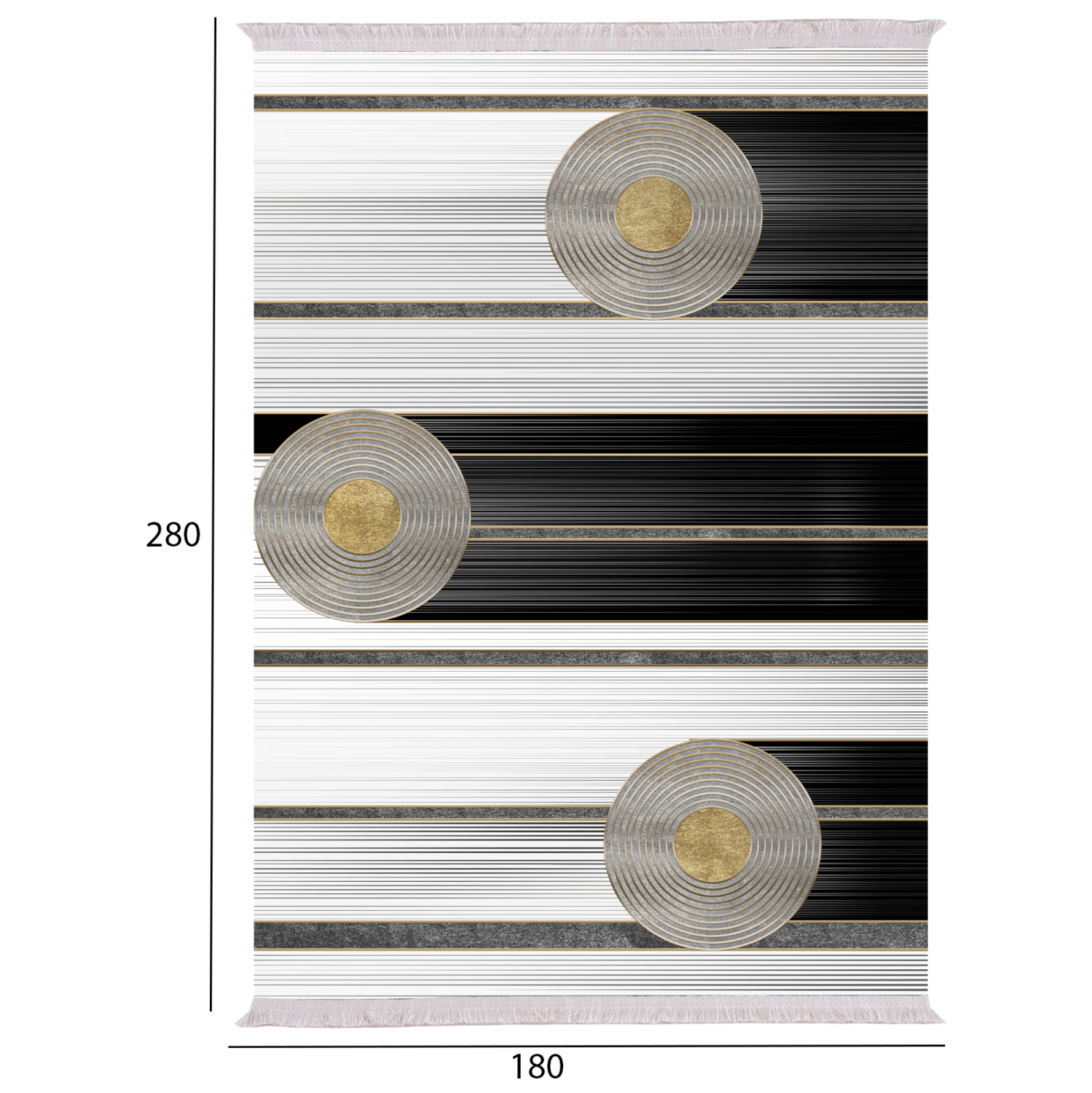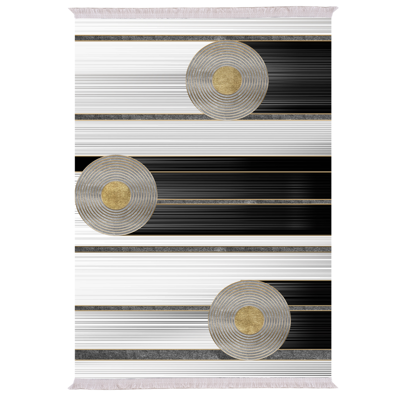 Το συγκεκριμένο χαλί είναι μοντέρνο από όποια οπτική κι αν το δεις. Έχει κυρίαρχα χρώματα το άσπρο, το γκρι, το μαύρο και το χρυσό. Το έντονο χαρακτηριστικό του είναι οι λευκοί δίσκοι με τα χρυσά κέντρα, που δίνουν την αίσθηση της αιώρησης και της κίνησης και φυσικά θα προκαλέσει το ενδιαφέρον με την ιδιαίτερη λεπτομέρεια και συμμετρία των γραμμών του. Σίγουρα θα αναβαθμίσει αισθητικά το σαλόνι σας.