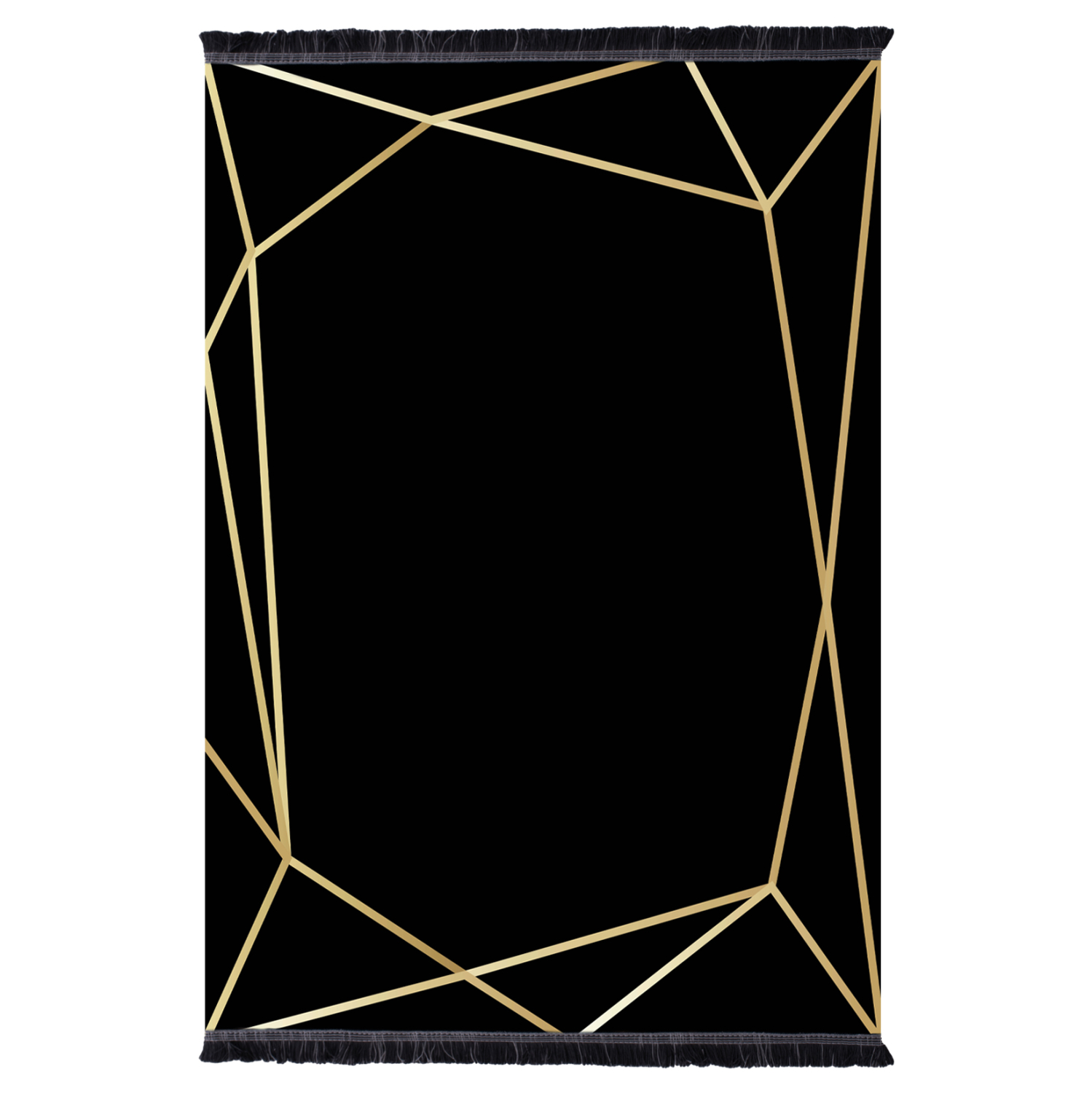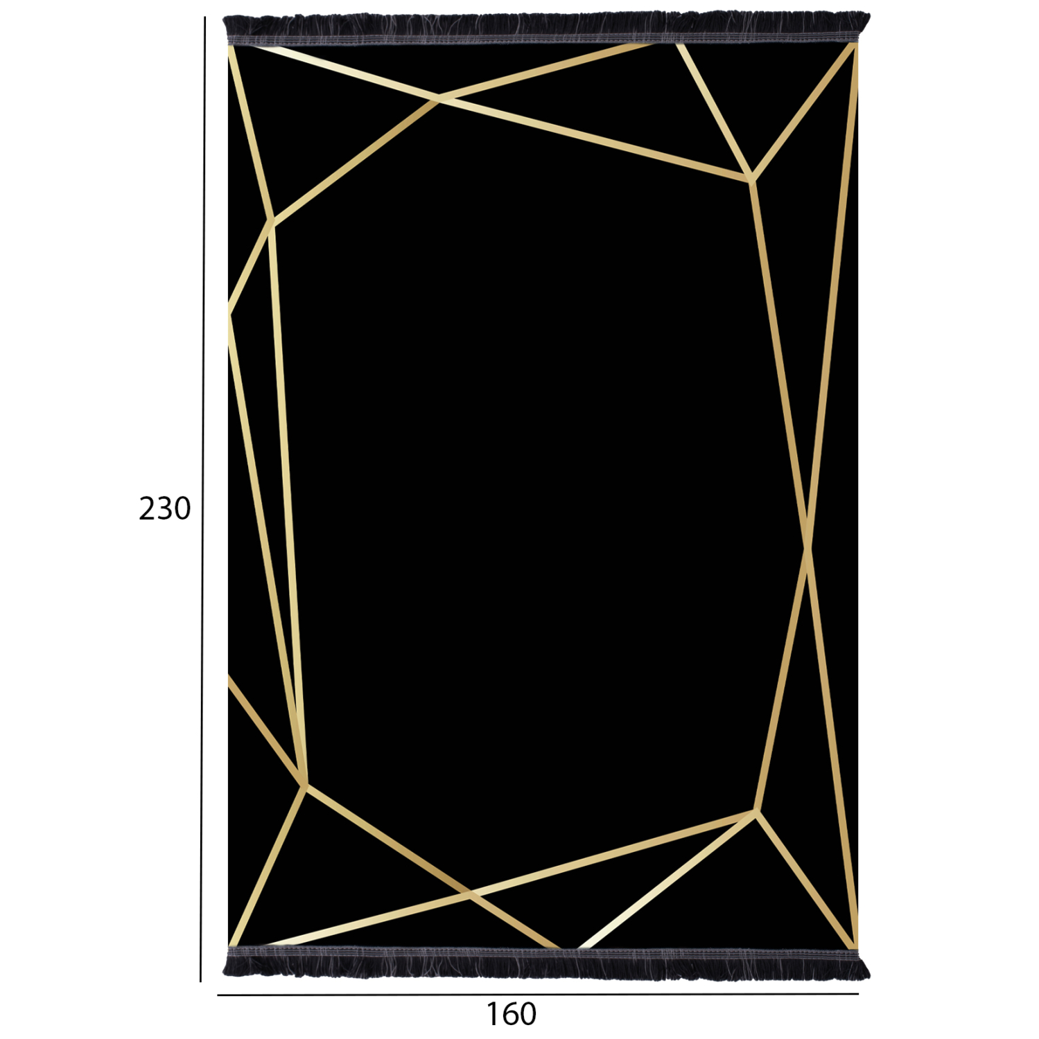 Το μοντέρνο αυτό χαλί, με μονόχρωμο φόντο σε μαύρο χρώμα και τριγωνικά σχέδια στην μπορντούρα σε χρυσό χρώμα θα αποτελέσει αντικείμενο συζητήσεων στο σαλόνι σας. Άλλωστε, η γοητεία πού ασκεί το χαλί είναι τόσο δυνατή, πού κανένα δεν αφήνει αδιάφορο.