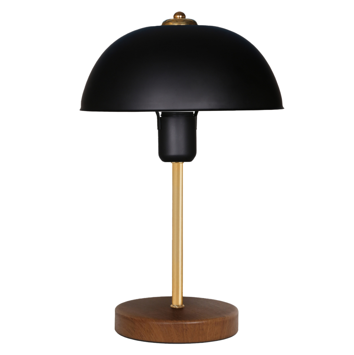 Επιτραπέζιο διακοσμητικό φωτιστικό με ξύλινη κυκλική βάση σε καφέ χρώμα και «καπέλο» σε σχήμα μανιτάρι σε μαύρο χρώμα. Το φως διαχέεται στον χώρο κυρίως προς τα κάτω και η αντανάκλασή του πάνω στην χρυσή μεταλλική κολωνίτσα του φωτιστικού παιχνιδίζει ευχάριστα στο μάτι. Αυτού του είδους τα φωτιστικά δεν προορίζονται για φωτιστικά διαβάσματος και αυτό πρέπει πάντα να λαμβάνεται υπόψη κατά την επιλογή τους. Είναι καθαρά διακοσμητικά και το ταίριασμά τους με τον περιβάλλοντα χώρο θα πρέπει να είναι αρμονικό. Αυτό το φωτιστικό είναι λιτό, κομψό και βολικό σε διαστάσεις παρέχοντας αμέτρητες δυνατότητες «δεσίματος» με την υπόλοιπη διακόσμησή σας. Είναι ένα μικρό έργο τέχνης.