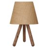Ένα πολύ ιδιαίτερο και μοντέρνο επιτραπέζιο φωτιστικό. Δεν έχει την κλασική βάση ενός επιτραπέζιου φωτιστικού αλλά στέκεται σε ένα ξύλινο τρίποδο με το καπέλο του να στηρίζεται στην κορυφή του τρίποδου. Η σχεδίαση παραπέμπει περισσότερο σε επιδαπέδιο φωτιστικό παρά σε ένα επιτραπέζιο. Τα πόδια έχουν το μέγεθος και την μορφή σκυτάλης σε καφέ χρωματισμό, ενώ το καπέλο του φωτιστικού είναι σε χρώμα μπεζ της άμμου και έχει κυκλικό και τραπεζοειδές σχήμα. Αυτού του είδους τα φωτιστικά δεν προορίζονται για φωτιστικά διαβάσματος και αυτό πρέπει πάντα να λαμβάνεται υπόψη κατά την επιλογή τους. Είναι καθαρά διακοσμητικά και το ταίριασμά τους με τον περιβάλλοντα χώρο θα πρέπει να είναι αρμονικό. Αυτό το φωτιστικό είναι μοντέρνο, κομψό και βολικό σε διαστάσεις παρέχοντας αμέτρητες δυνατότητες «δεσίματος» με την υπόλοιπη διακόσμησή σας. Είναι ένα μικρό έργο τέχνης.