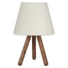 Ένα πολύ ιδιαίτερο και μοντέρνο επιτραπέζιο φωτιστικό. Δεν έχει την κλασική βάση ενός επιτραπέζιου φωτιστικού αλλά στέκεται σε ένα ξύλινο τρίποδο με το καπέλο του να στηρίζεται στην κορυφή του τρίποδου. Η σχεδίαση παραπέμπει περισσότερο σε επιδαπέδιο φωτιστικό παρά σε ένα επιτραπέζιο. Τα πόδια έχουν το μέγεθος και την μορφή σκυτάλης σε καφέ χρωματισμό, ενώ το καπέλο του φωτιστικού είναι σε χρώμα εκρου και έχει κυκλικό και τραπεζοειδές σχήμα. Αυτού του είδους τα φωτιστικά δεν προορίζονται για φωτιστικά διαβάσματος και αυτό πρέπει πάντα να λαμβάνεται υπόψη κατά την επιλογή τους. Είναι καθαρά διακοσμητικά και το ταίριασμά τους με τον περιβάλλοντα χώρο θα πρέπει να είναι αρμονικό. Αυτό το φωτιστικό είναι μοντέρνο, κομψό και βολικό σε διαστάσεις παρέχοντας αμέτρητες δυνατότητες «δεσίματος» με την υπόλοιπη διακόσμησή σας. Είναι ένα μικρό έργο τέχνης.