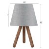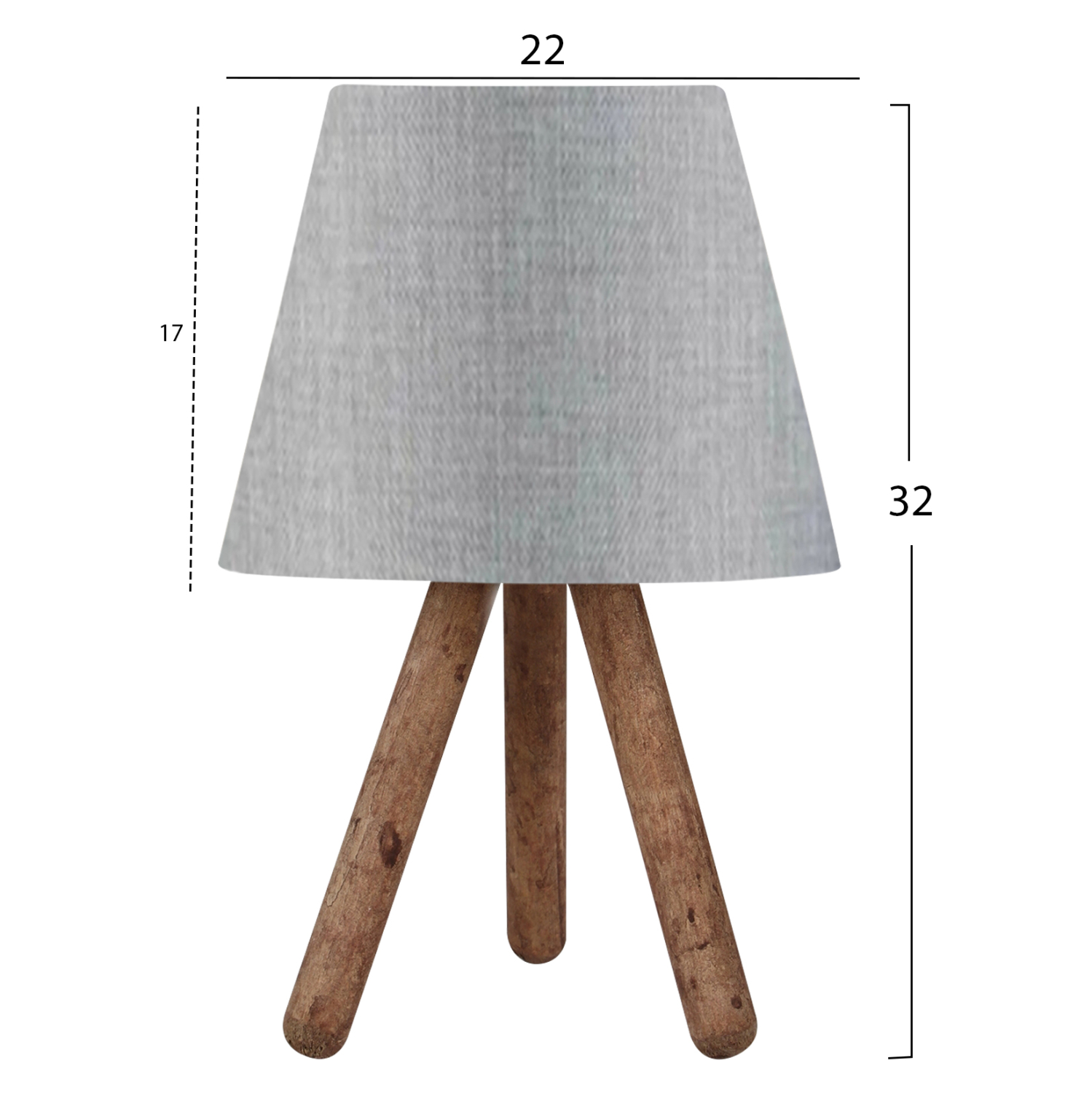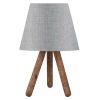 Ένα πολύ ιδιαίτερο και μοντέρνο επιτραπέζιο φωτιστικό. Δεν έχει την κλασική βάση ενός επιτραπέζιου φωτιστικού αλλά στέκεται σε ένα ξύλινο τρίποδο με το καπέλο του να στηρίζεται στην κορυφή του τρίποδου. Η σχεδίαση παραπέμπει περισσότερο σε επιδαπέδιο φωτιστικό παρά σε ένα επιτραπέζιο. Τα πόδια έχουν το μέγεθος και την μορφή σκυτάλης σε καφέ χρωματισμό, ενώ το καπέλο του φωτιστικού είναι γκρι και έχει κυκλικό και τραπεζοειδές σχήμα. Αυτού του είδους τα φωτιστικά δεν προορίζονται για φωτιστικά διαβάσματος και αυτό πρέπει πάντα να λαμβάνεται υπόψη κατά την επιλογή τους. Είναι καθαρά διακοσμητικά και το ταίριασμά τους με τον περιβάλλοντα χώρο θα πρέπει να είναι αρμονικό. Αυτό το φωτιστικό είναι μοντέρνο, κομψό και βολικό σε διαστάσεις παρέχοντας αμέτρητες δυνατότητες «δεσίματος» με την υπόλοιπη διακόσμησή σας. Είναι ένα μικρό έργο τέχνης.