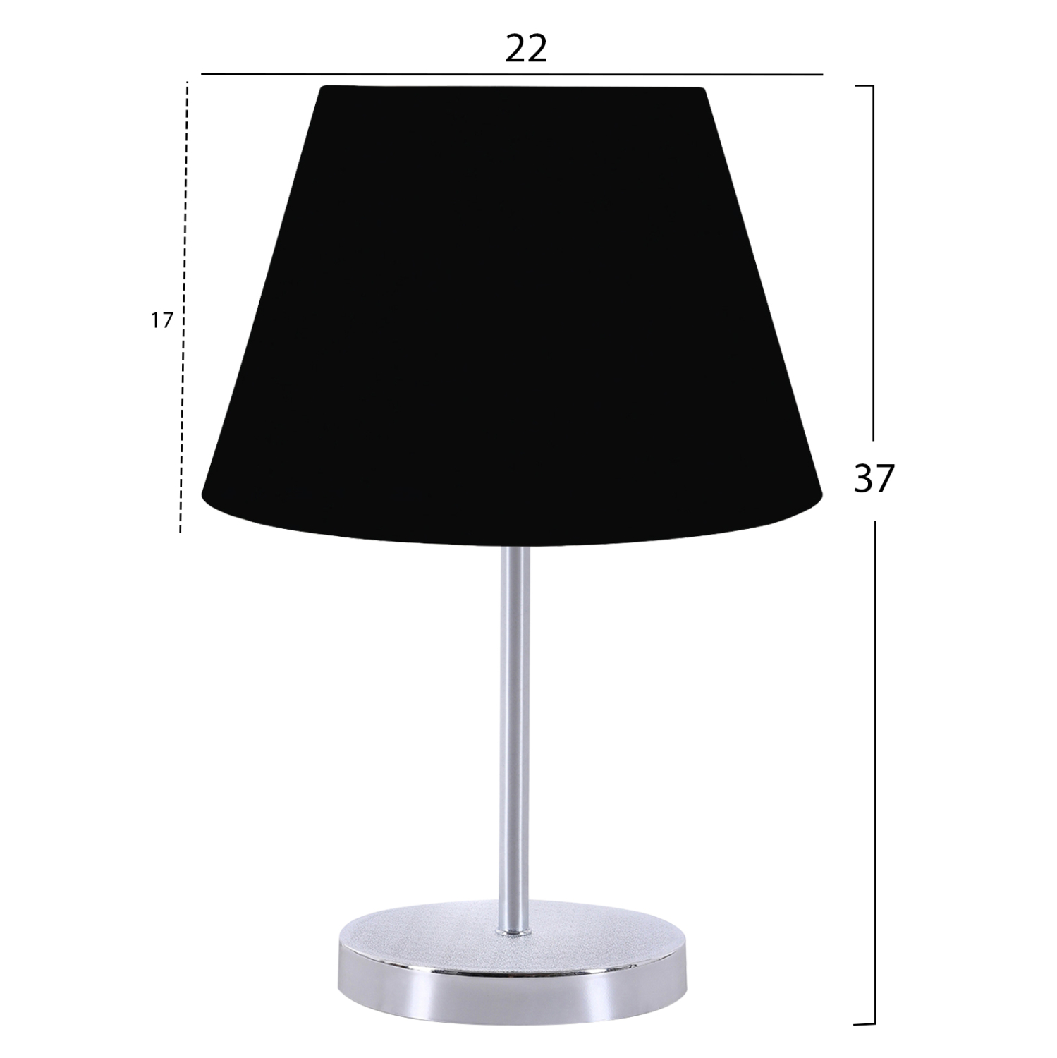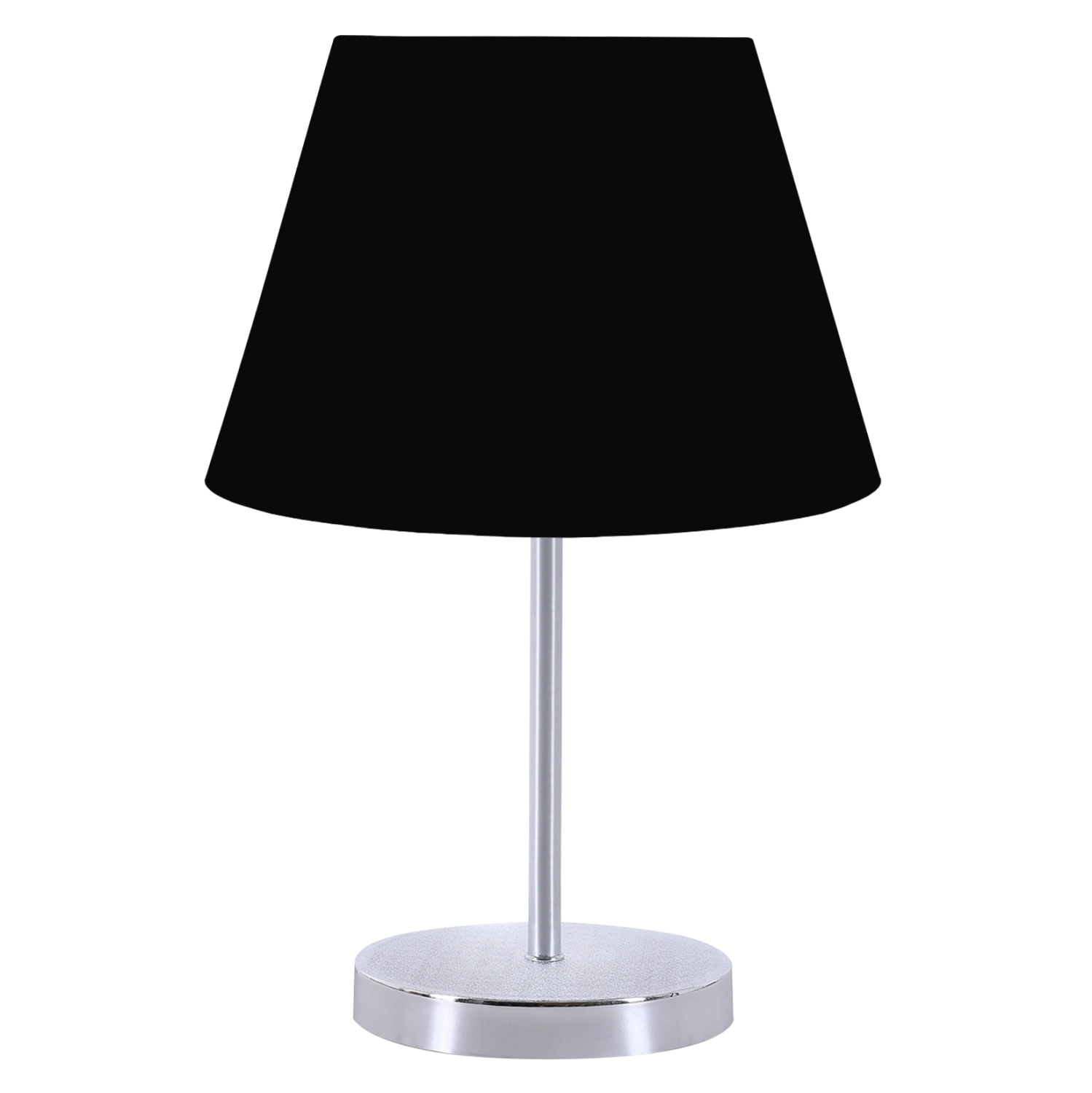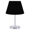 Μοντέρνο επιτραπέζιο φωτιστικό με κυκλική βάση και κολώνα χρωμιωμένα, και μαύρο υφασμάτινο τραπεζοειδές καπέλο. Πρόκειται για διακοσμητικό φωτιστικό, σε απλή και λιτή γραμμή. Το φως διαχέεται στον χώρο ευχάριστα και η αντανάκλασή του πάνω στην χρωμιωμένη κολωνίτσα του φωτιστικού αλλά και στην χρωμιωμένη επιφάνεια της βάσης, παιχνιδίζει ευχάριστα στο μάτι. Αυτού του είδους τα φωτιστικά δεν προορίζονται για φωτιστικά διαβάσματος και αυτό πρέπει πάντα να λαμβάνεται υπόψη κατά την επιλογή τους. Είναι καθαρά διακοσμητικά και το ταίριασμά τους με τον περιβάλλοντα χώρο θα πρέπει να είναι αρμονικό. Αυτό το φωτιστικό είναι κομψό και βολικό σε διαστάσεις παρέχοντας αμέτρητες δυνατότητες «δεσίματος» με την υπόλοιπη διακόσμησή σας. Είναι ένα μικρό έργο τέχνης.