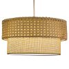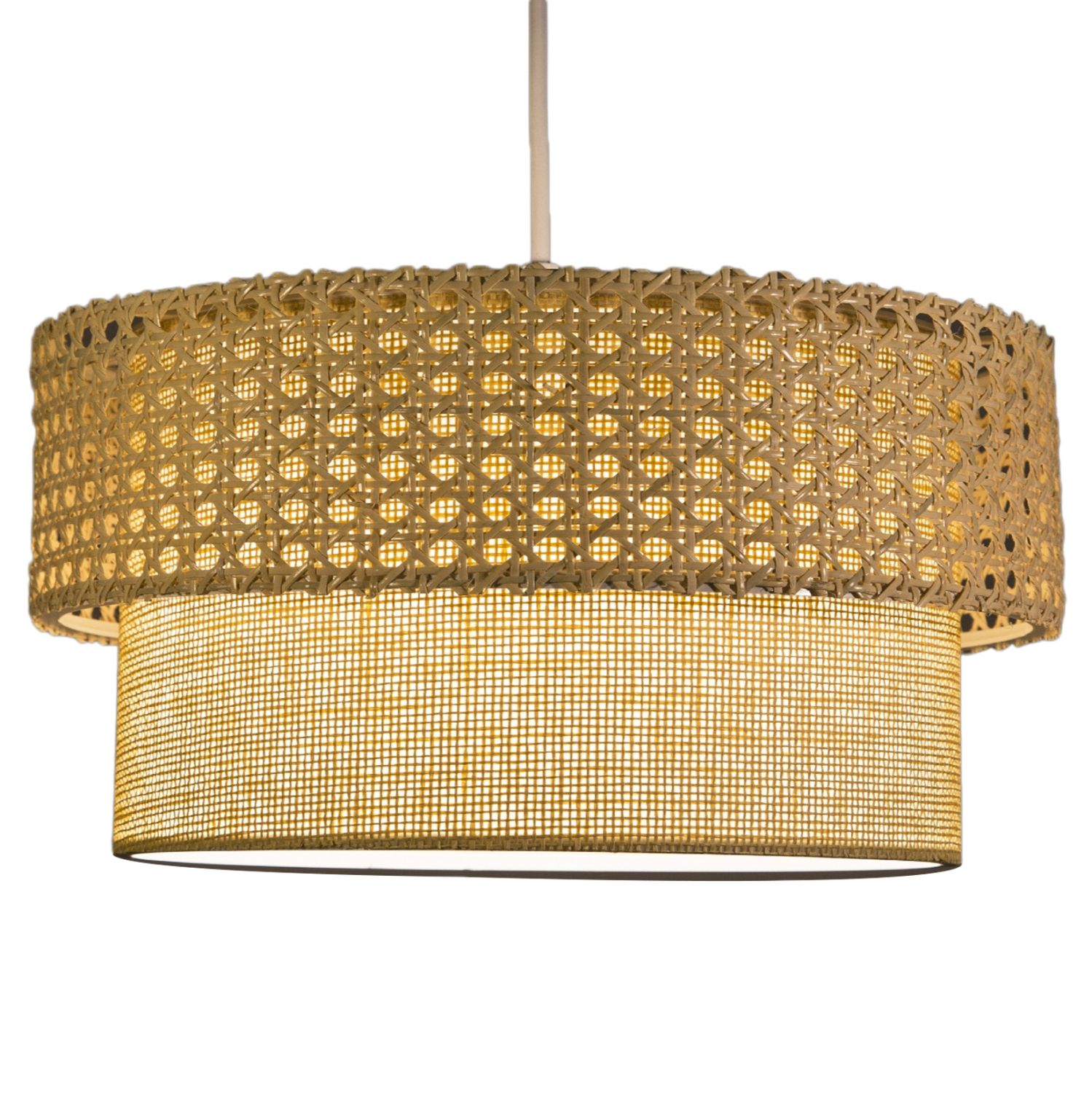 Η υφή του υφάσματος και η πλέξη rattan από πάνω, μπορεί να είναι λίγο ασυνήθιστη για κρεμαστό φωτιστικό, αλλά χάρη στο ανοιχτό χρώμα των τυμπάνων, δίνει στο φως μια απαλή λάμψη.