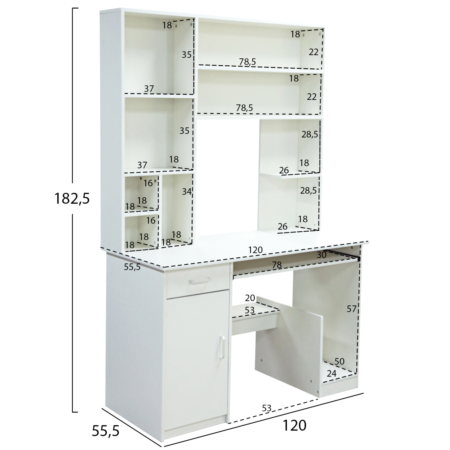Το ΗΜ2032.03 είναι μια σύνθεση που διαθέτει ένα ντουλάπι στην αριστερή πλευρά, ένα συρτάρι και μια συρταρωτή θέση για πληκτρολόγιο κάτω από την επιφάνεια. Στην δεξιά κάτω πλευρά υπάρχει έτοιμη βάση για ηλεκτρονικό υπολογιστή με ανοιχτό το πίσω μέρος για την εύκολη σύνδεση των καλωδίων. Το επάνω μέρος της σύνθεσης, είναι η βιβλιοθήκη-ραφιέρα με 9 ξεχωριστούς ανοιχτούς χώρους για βιβλία ή οτιδήποτε άλλο θέλετε να έχετε στο γραφείο σας!