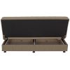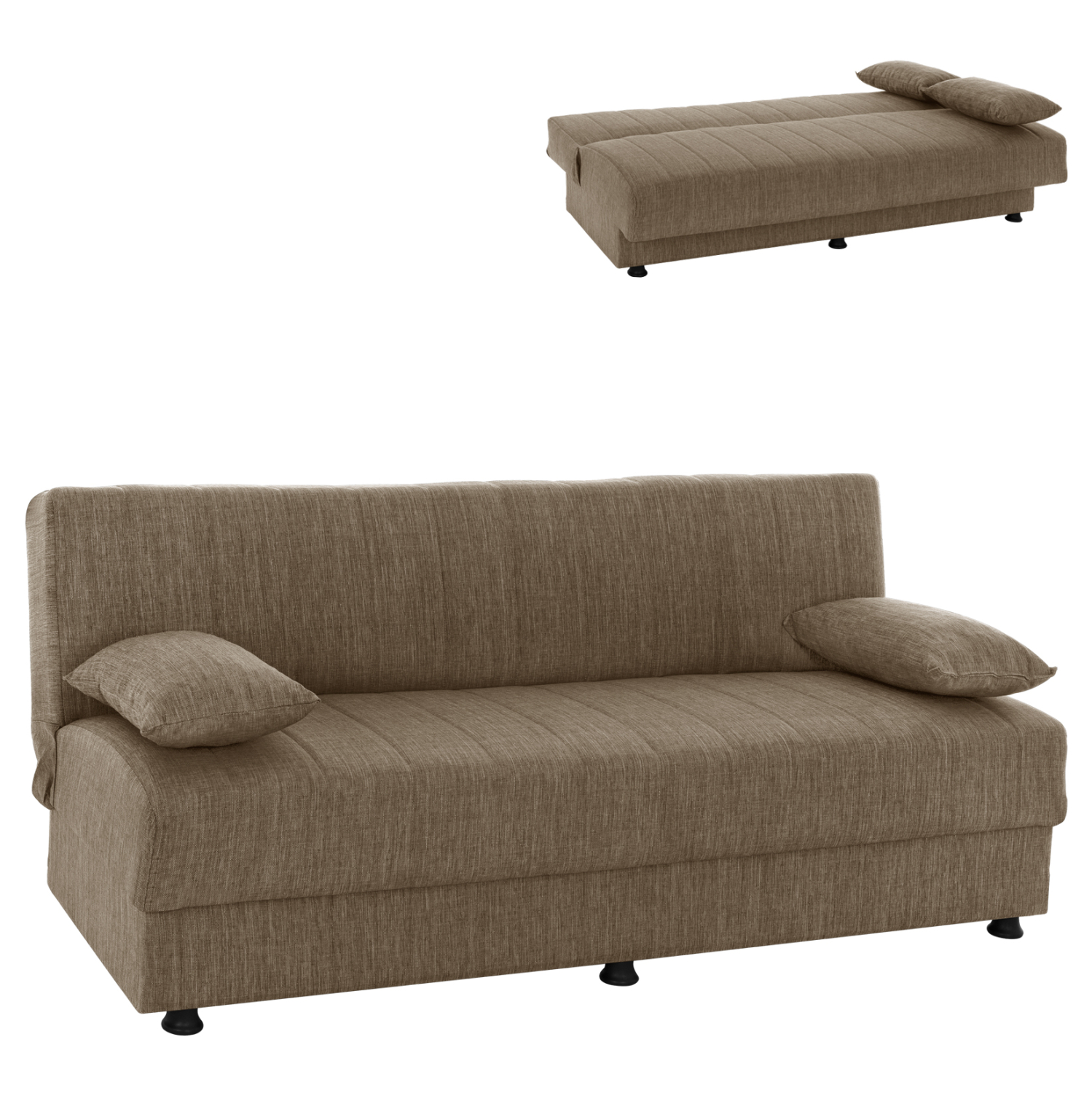 Ξεκινώντας από τα βασικά και τα προφανή, το χρώμα της επένδυσης με το εξαιρετικό και καλοραμμένο ανάγλυφο ύφασμα αυτού του καναπέ, είναι καφέ. Διαθέτει 2 μικρά μακρόστενα μαξιλάρια με το ίδιο ύφασμα που μπορούν να χρησιμοποιηθούν όπως θέλει ο καθένας. Χαρακτηριστικό αυτού του καναπέ είναι ότι δεν διαθέτει μπράτσα με αποτέλεσμα να μην περιορίζει την χρήση του από τους χρήστες του. Επίσης, γίνεται πολύ εύκολα κρεβάτι μέσω ενός εύχρηστου μηχανισμού (κλικ-κλακ) πολλαπλασιάζοντας την χρησιμότητά του. Κάτω από το κάθισμα του καναπέ υπάρχουν 2 αποθηκευτικοί χώροι με ενισχυμένο πάτωμα καθιστώντας τον ένα πραγματικό πολυεργαλείο, ειδικά για φοιτητικά σπίτια αλλά και σπίτια με περιορισμένο γενικά χώρο.