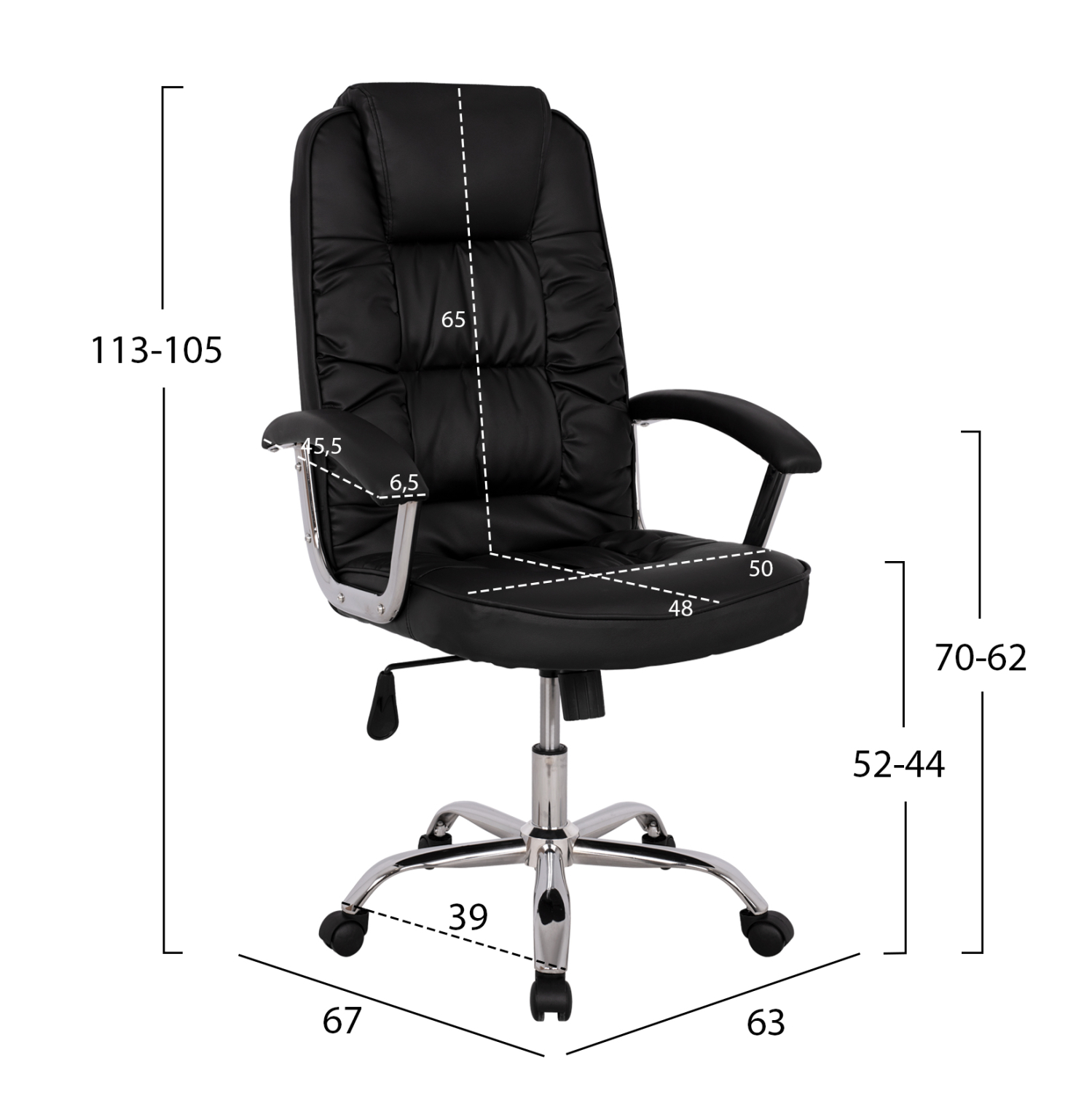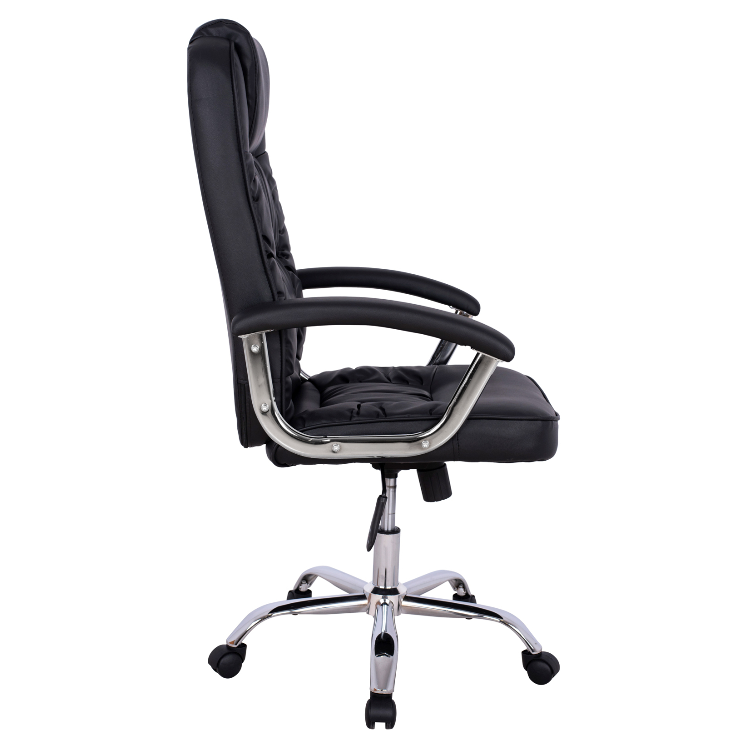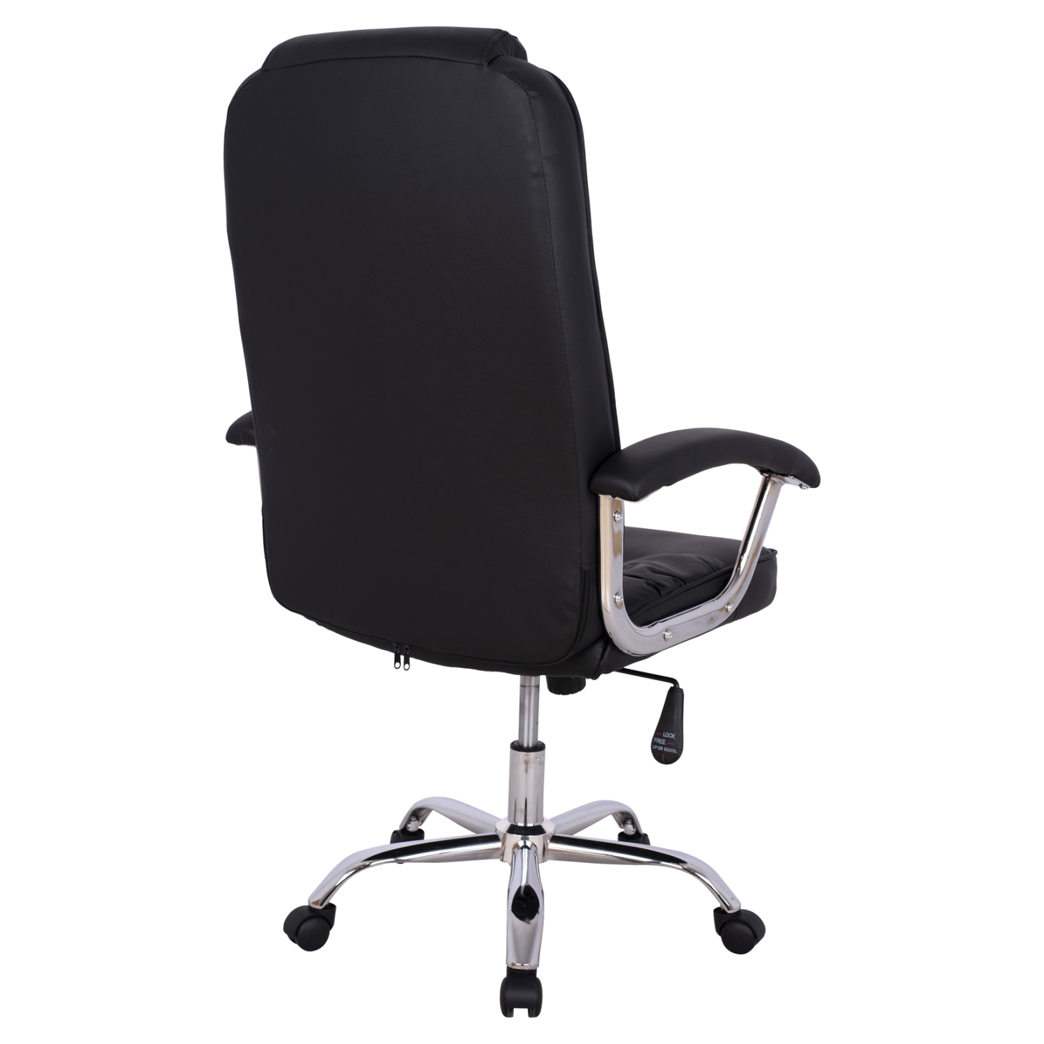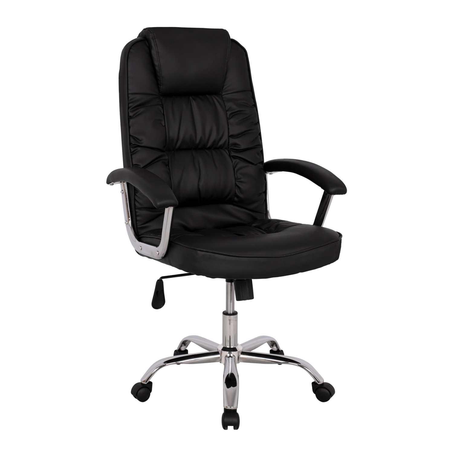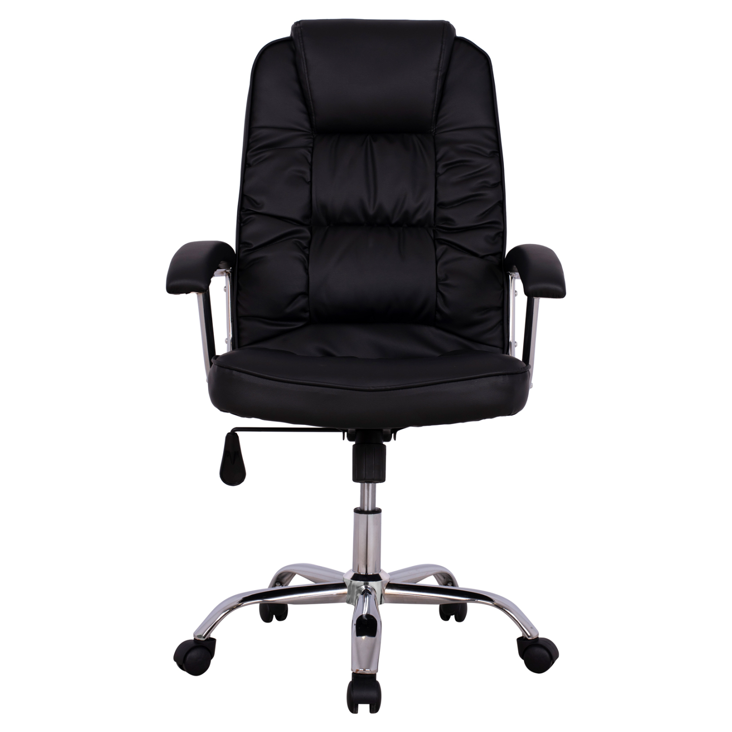 Διευθυντική καρέκλα γραφείου “REESE” σε μαύρο χρώμα. Μια «πλούσια» καρέκλα γραφείου με ψηλά μπράτσα με ελαφριά κλίση και επενδυμένα με μια στρώση αφρολέξ σε PU δέρμα. Η πλάτη είναι ψηλή με πλούσια στρώση από αφρώδη υλικά και έξτρα ενσωματωμένο μαξιλάρι για το κεφάλι για άνεση κατά την χρήση και υποστηρίζει ολόκληρο τον κορμό σας, ενώ είναι επενδυμένη με υψηλής ποιότητας PU δέρμα , όπως επίσης και το φαρδύ και αναπαυτικό κάθισμα με την αναπαυτική επιφάνεια. Η βάση είναι χρωμιωμένη σε σχήμα «αστέρι» με κυρτά πόδια και μαύρα ροδάκια.