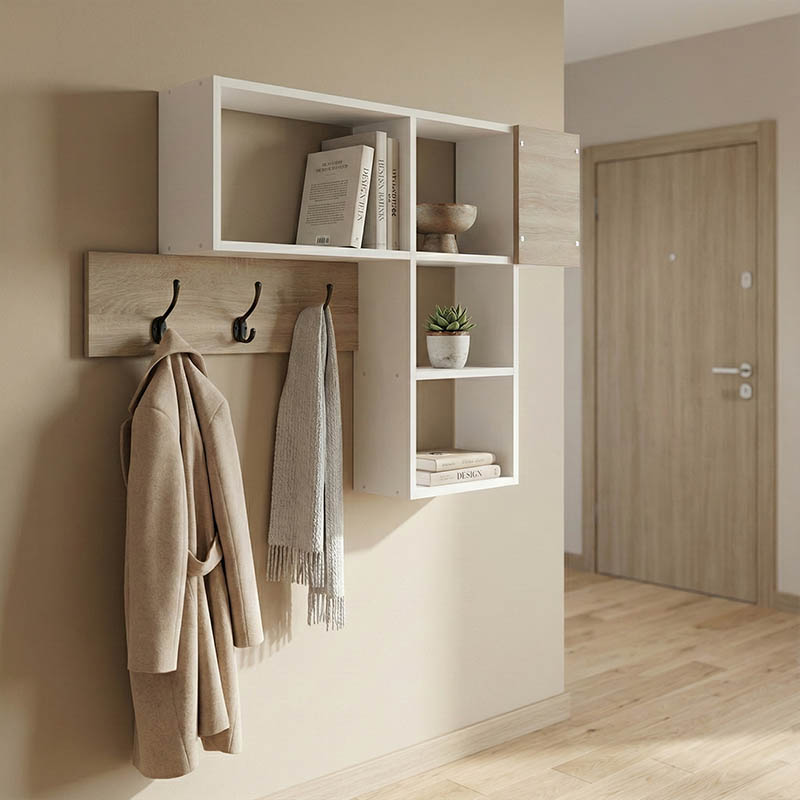 Αξιοποιήστε στο έπακρο τον χώρο της εισόδου, του χωλ ή οποιουδήποτε δωματίου με αυτή την ευέλικτη και μοντέρνα σύνθεση τοίχου. Συνδυάζει την πρακτικότητα μιας κρεμάστρας με τον επιπλέον αποθηκευτικό χώρο των ραφιών.