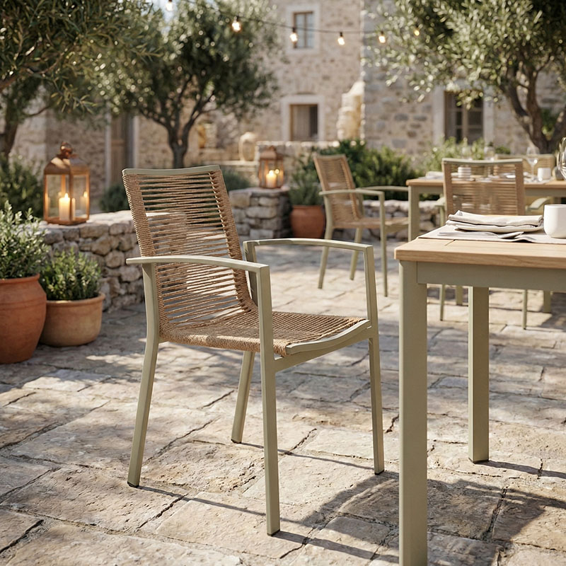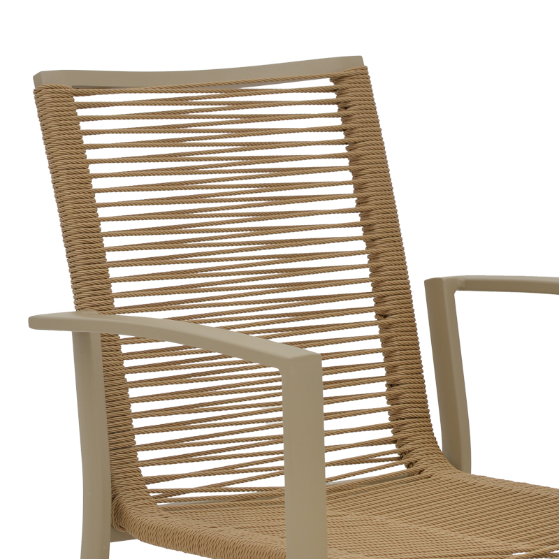 - Επένδυση καθίσματος με εξαιρετικής ποιότητας ύφασμα textilene σε φυσικό χρώμα. Το textilene είναι πλενόμενο και ανθεκτικό στις συνθήκες του εξωτερικού πέριβάλλοντος (ηλιακή ακτινοβολία, υγρασία).
