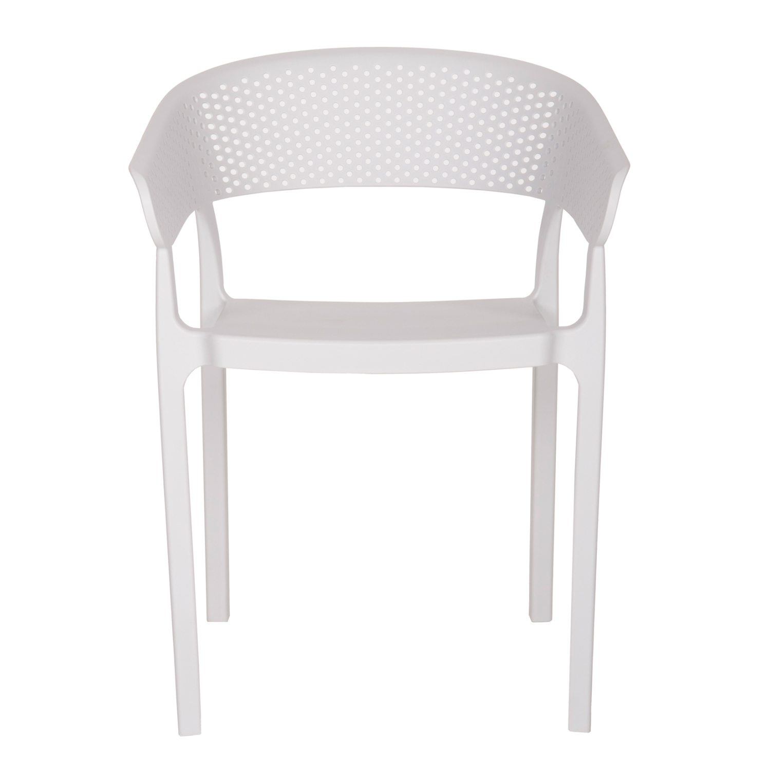 Πολυθρόνα πολυπροπυλενίου σε ΛΕΥΚΟ χρώμα. Ιδανική πρόταση για χρήση σε εξωτερικούς χώρους, είτε επαγγελματικούς (χώροι δεξιώσεων, εταιρείες catering, κλπ.) είτε για το σπίτι. Η πολυθρόνα αποτελείται από ένα λείο κάθισμα και μια ημικυκλική, ανεξάρτητη και «τρυπητή» πλάτη και μπράτσα. Είναι πανέμορφη και θα αναβαθμίσει αισθητικά κάθε εξωτερικό χώρο.