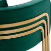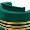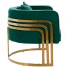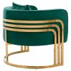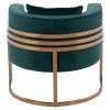 Η πολυθρόνα ΤΙΑΝΑ είναι μια πανέμορφη πολυθρόνα σε κυπαρισσί χρώμα και μεταλλικό σκελετό σε χρυσό χρώμα. Ο σκελετός καταλήγει στα πόδια της πολυθρόνας που είναι σε ημικυκλική διάταξη βάσης με 3 κάθετα σταθερά πάνω στο μεταλλικό ημικύκλιο. Μια καρέκλα που δίνει κάτι το ξεχωριστό σε οποιοδήποτε επαγγελματικό χώρο. Ξεχωριστή, ποιοτική και κομψή σίγουρα θα τραβήξει τα βλέμματα. Η πλάτη είναι χαμηλή αλλά συνοδεύεται από ένα μαλακό μαξιλάρι, ενώ όλη η πολυθρόνα έχει βελούδινη επένδυση με ρέλι στις ραφές, πράγμα που επιτείνει τον ιδιαίτερο χαρακτήρα αυτής της πολυθρόνας.