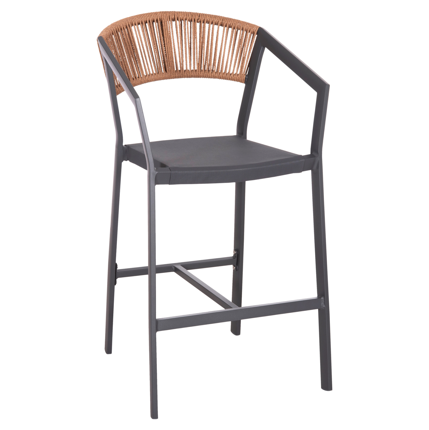 Η πλάτη του σκαμπό είναι επενδυμένη με πολυεστερικό RATTAN. Στα περισσότερα έπιπλα κήπου και γενικά σε έπιπλα για εξωτερικούς χώρους χρησιμοποιείται συνθετικό υλικό από PVC, δηλαδή τεχνητές ίνες υψηλής ποιότητας. Αυτό δίνει στην κατασκευή εξαιρετική αντοχή και ανθεκτικότητα σε ακραίες συνθήκες ζέστης ή κρύου.