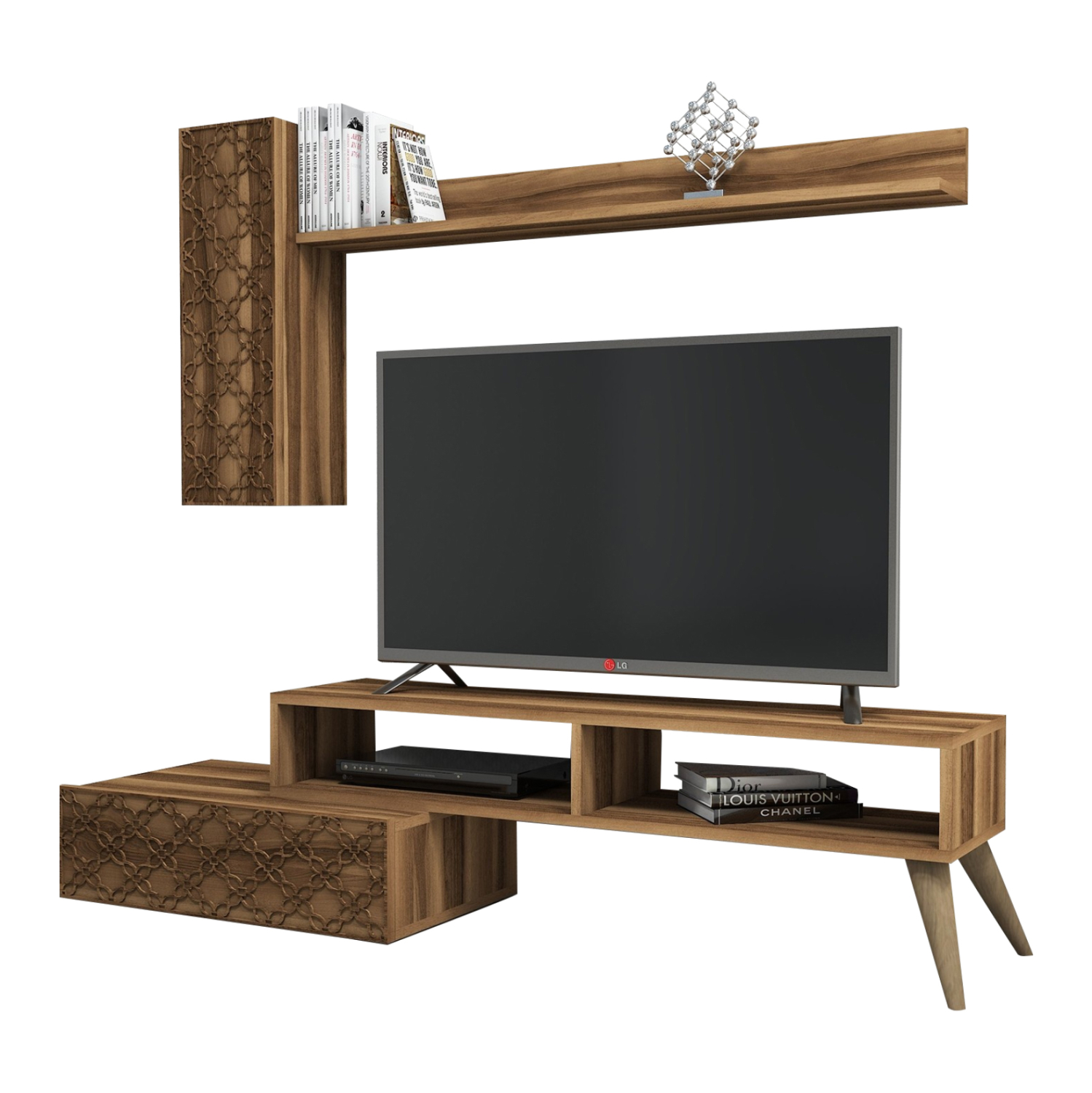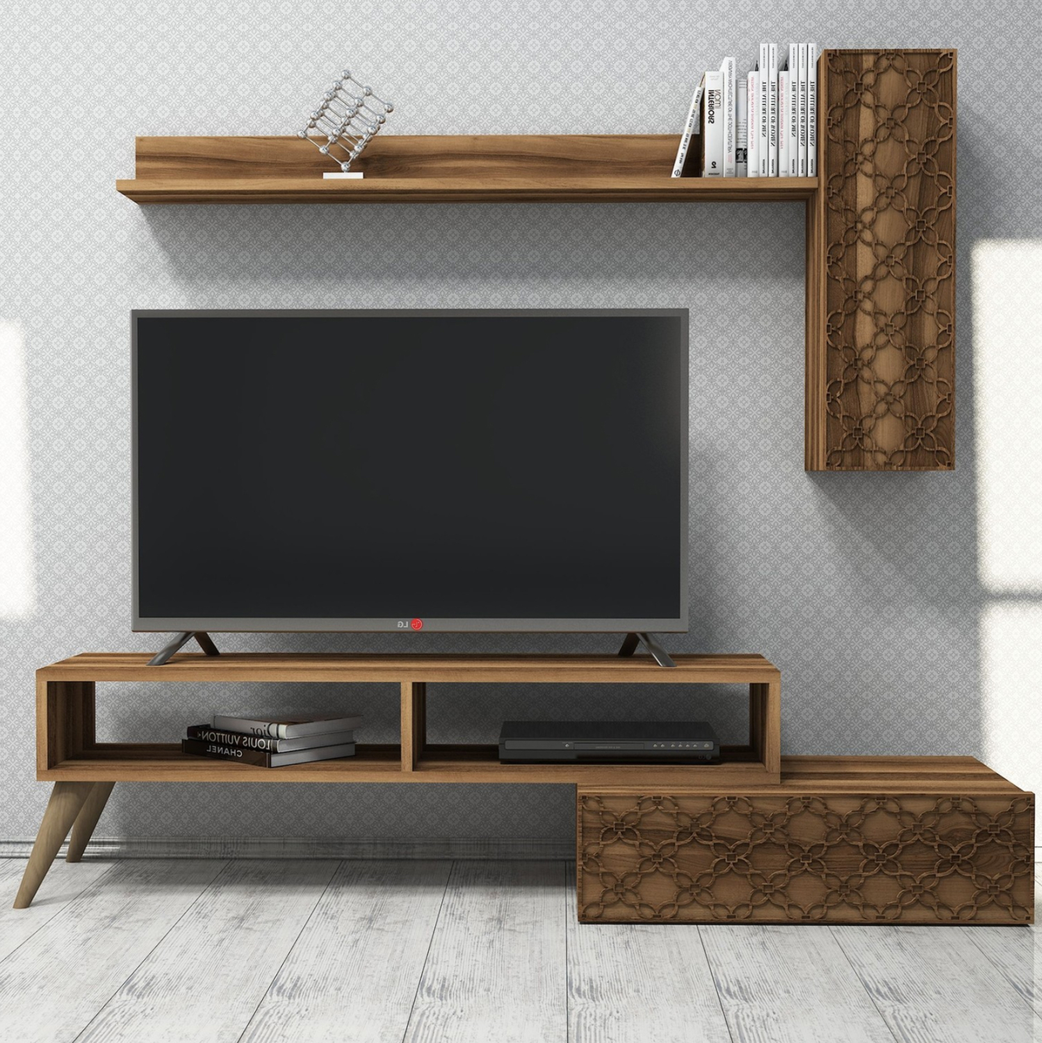 Το ΗΜ9518.03 είναι μια μοντέρνα όσο και πρακτική σύνθεση τηλεόρασης σε ΚΑΡΥΔΙ χρώμα, που θα ομορφύνει το σαλόνι σας! Αποτελείται από το κυρίως έπιπλο στο δάπεδο, το οποίο έχει ορθογώνιο σχήμα, και στηρίζεται σε δύο πόδια στην μία άκρη και σε ένα ντουλάπι με ΚΑΡΥΔΙ πόρτα και όμορφα σχέδια ξύλου στην άλλη άκρη. Η σύνθεση ολοκληρώνεται με ένα μακρόστενο ντουλάπι τοίχου με ΚΑΡΥΔΙ πόρτα με σχέδια ξύλου κι ένα ράφι μέσα, κι ένα εξωτερικό μακρύ ράφι τοίχου. Μια σύνθεση που θα δώσει στο σαλόνι σας μια πραγματικά όμορφη και μοντέρνα όψη.