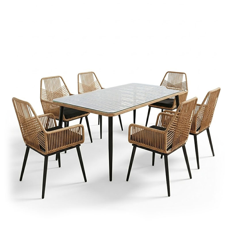 Τραπεζαρία Naoki-Tanish σετ 7τεμ pakoworld μέταλλο μαύρο-pe φυσικό-γυαλί 160x90x78εκ