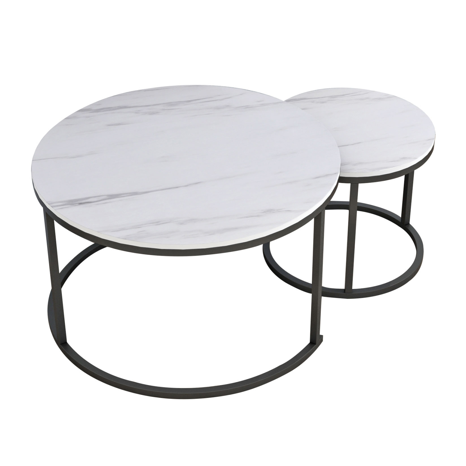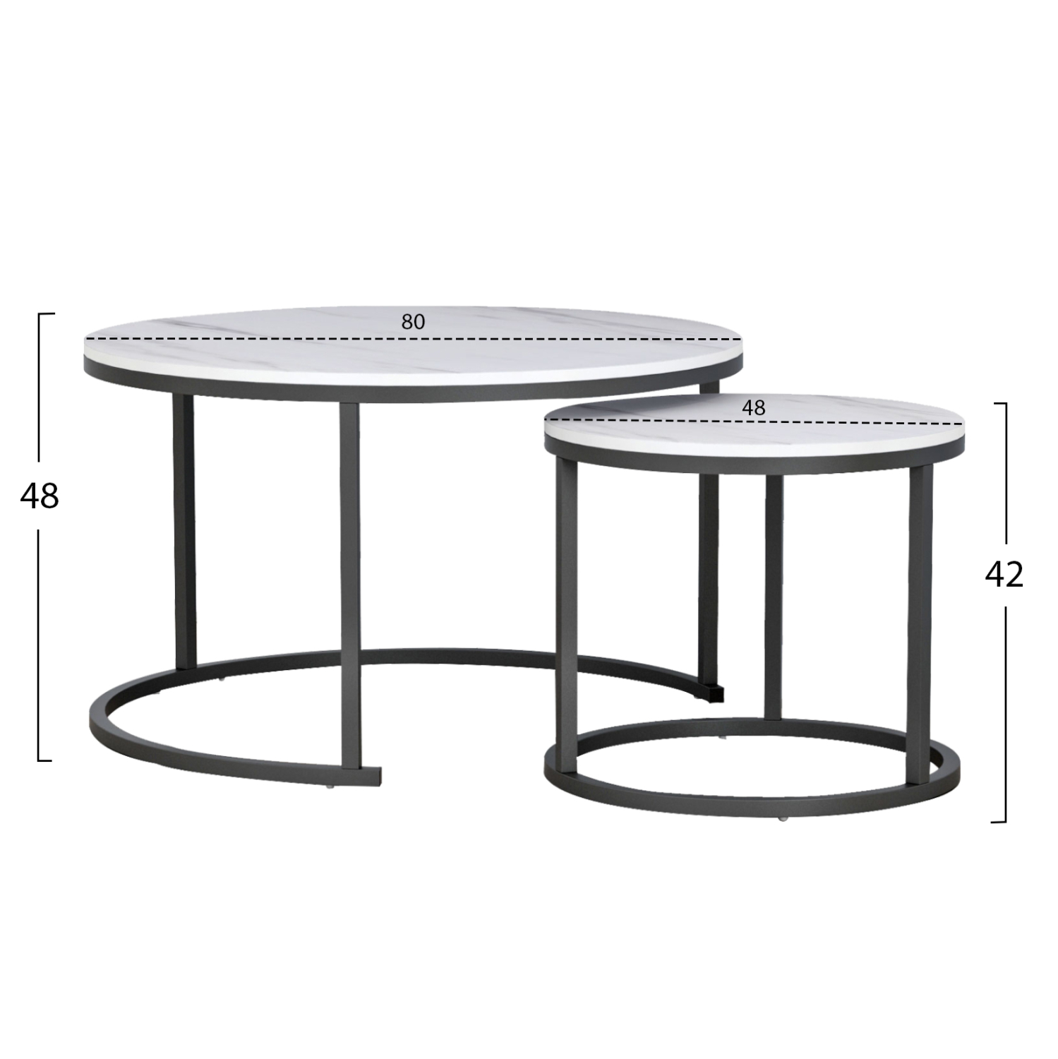 ΗΜ8763.12 τραπεζάκια σαλονιού—– Τα τραπεζάκια ΗΜ8763.12 θα σας ενθουσιάσουν με το στυλ και την πρακτικότητά τους. Πρόκειται για 2 τραπεζάκια ένα ψηλότερο κι ένα πιο κοντό με ιδιαίτερο χαρακτηριστικό ότι το ψηλότερο στηρίζεται σε μια ημικυκλική βάση με τρία μεταλλικά πόδια, πράγμα που επιτρέπει στο πιο κοντό να χωράει και να αποθηκεύεται ακριβώς από κάτω. Οι βάσεις και των δύο τραπεζιών είναι μεταλλικές σε μαύρο χρώμα, ενώ οι επιφάνειές τους είναι σε απομίμηση λευκού μαρμάρου από MDF.