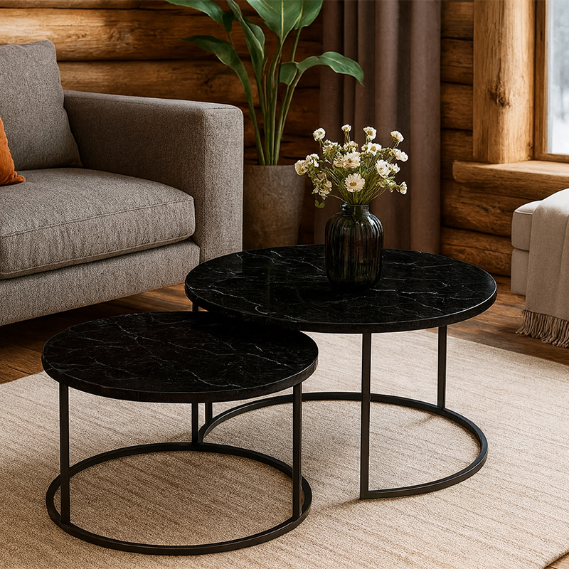 Αναβαθμίστε το σαλόνι σας με το πρακτικό και μοντέρνο σετ δύο ένθετων τραπεζιών σαλονιού Solme. Σχεδιασμένα για να φωλιάζουν το ένα κάτω από το άλλο, προσφέρουν ευελιξία, εξοικονόμηση χώρου και μια σύγχρονη αισθητική που συνδυάζει τη κομψότητα του μαρμάρου με τη δυναμική γραμμή του μαύρου μετάλλου.