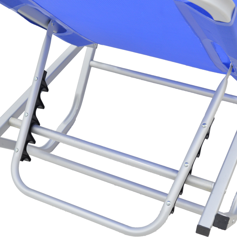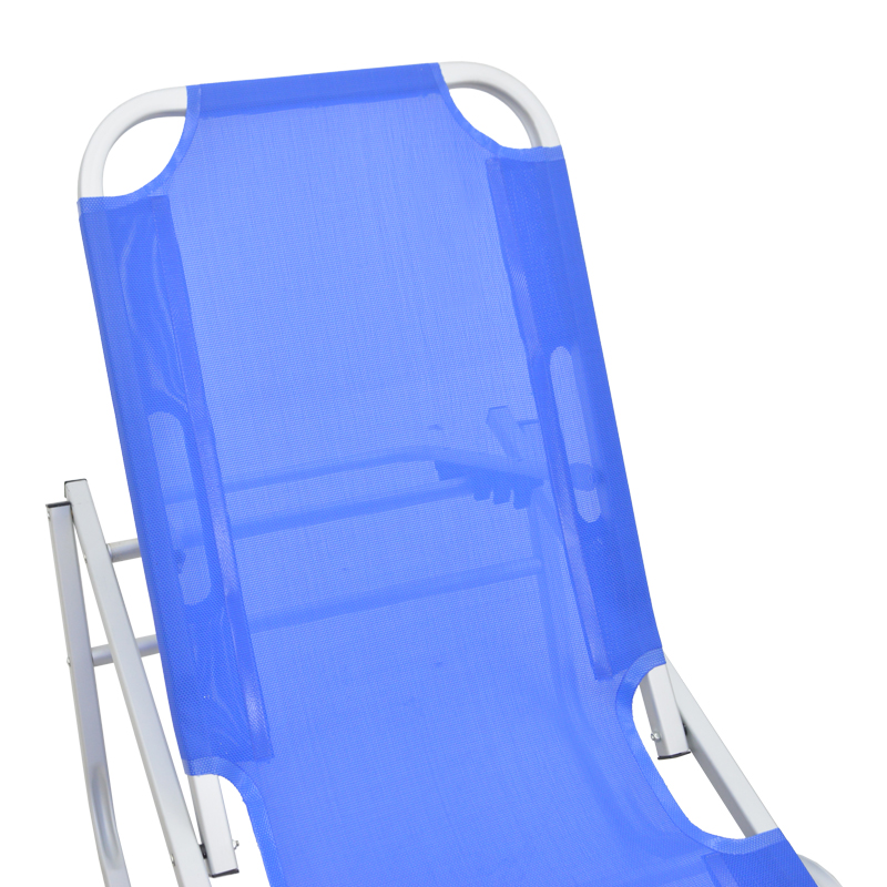 - Επένδυση υφάσματος textinene σε χρώμα μπλε. Το textilene είναι ύφασμα μεγάλης αντοχής στην ηλιακή ακτινοβολία UV και την υγρασία, ενώ παράλληλα αφήνει το δέρμα να “αναπνέει” δημιουργώντας έτσι άνεση στην έδραση.