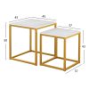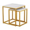 ΗΜ8762.11 τραπεζάκια σαλονιού—– Τα τραπεζάκια ζιγκόν GRELAY θα σας ενθουσιάσουν με το στυλ και την πρακτικότητά τους. Μπορείτε να δημιουργήσετε πρωτότυπες διακοσμητικές συνθέσεις, δίνοντας νέα πνοή στον χώρο σας με αυτό το σετ. Πρόκειται για 2 τετράγωνα τραπεζάκια ένα ψηλότερο κι ένα πιο κοντό που αποθηκεύεται κάτω από το ψηλό. Τα πόδια σε στυλ βάση, είναι μεταλλικά σε χρυσό χρώμα, ενώ οι επιφάνειές τους είναι σε απομίμηση λευκού μαρμάρου από MDF.